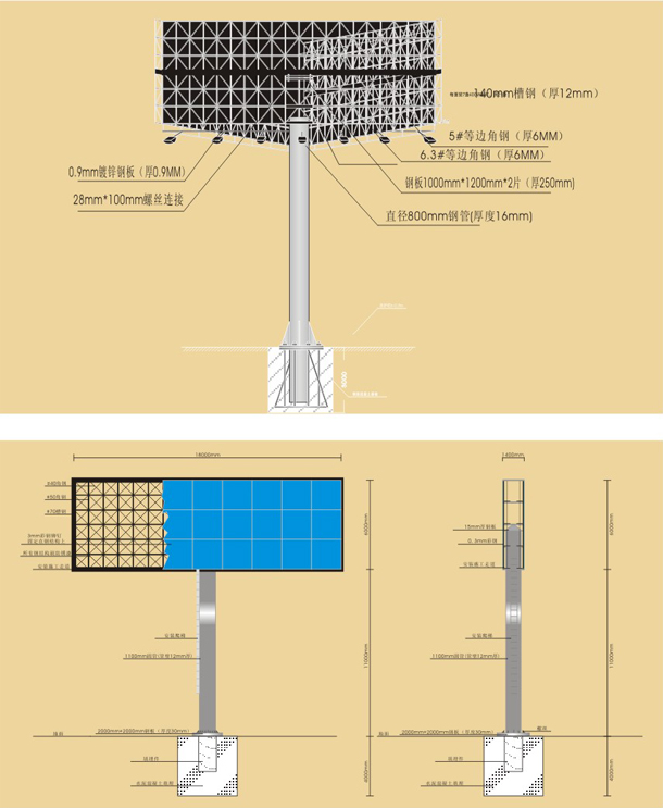 目前常用的单立柱广告牌单面牌面尺寸主 单立柱要为18m×6m,也有5m×15m及7m×21m的牌面尺寸,在设计牌面尺寸时尚应考虑地方市容管理等方面的规定,如上海市规定牌面尺寸不得大于6m×18m。单立柱广告牌的高度根据路面的高度而有所差异,国内常用的高度一般为路面以上18m顶部算起),由于考虑到广告效果,近几年单立柱广告牌的高度有逐步增加的趋势,如上海地区目前已较少采用18m的高度,总高度25m的单立柱广告牌较为常见,有的甚至达到了三十多米高。
